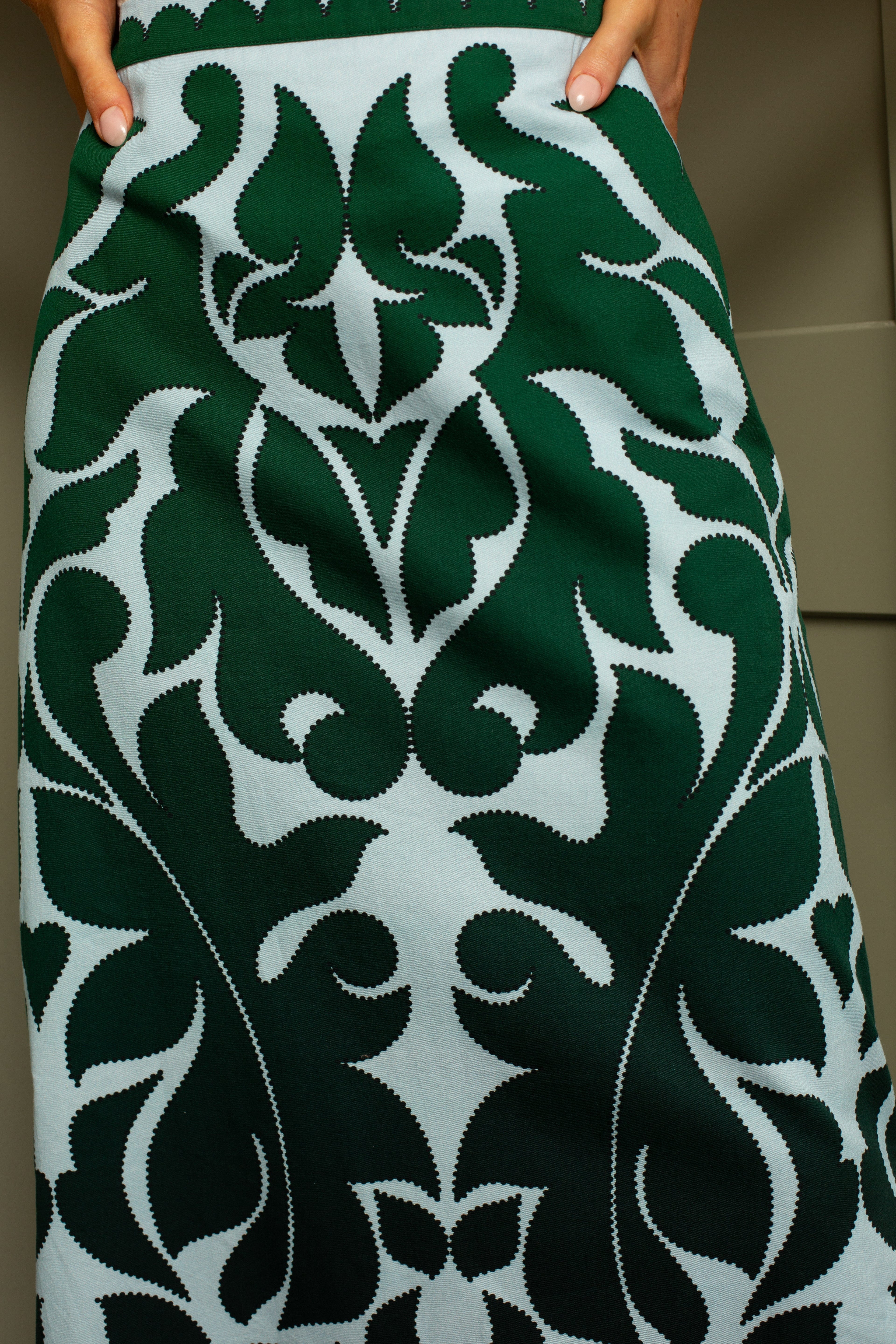 The Portia Skirt combines a sophisticated silhouette with a playful touch through its fun print. Featuring side slits for graceful movement and a side zipper for a seamless fit, this skirt offers both style and comfort. Perfect for making a polished statement at any occasion.