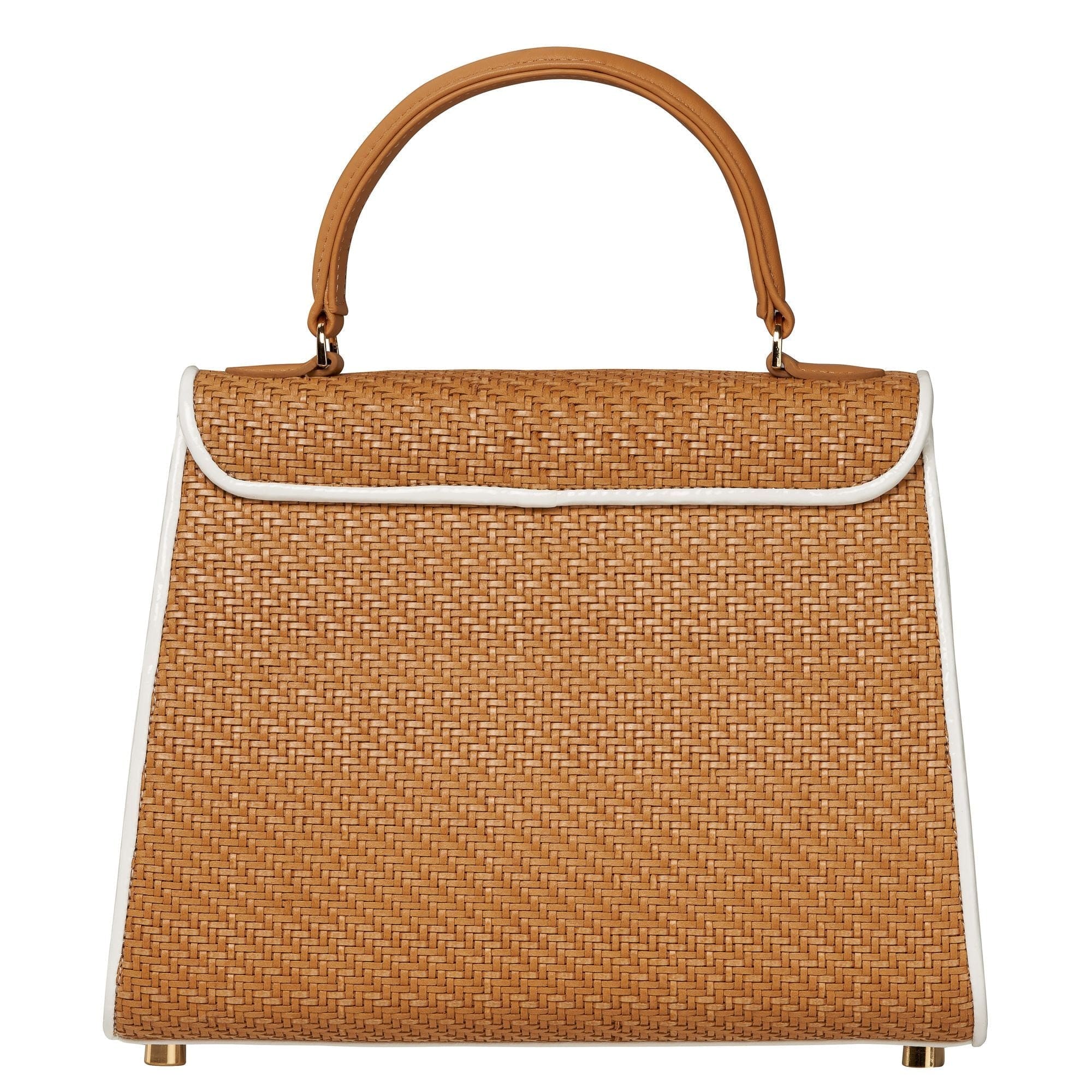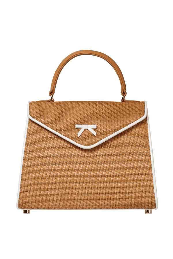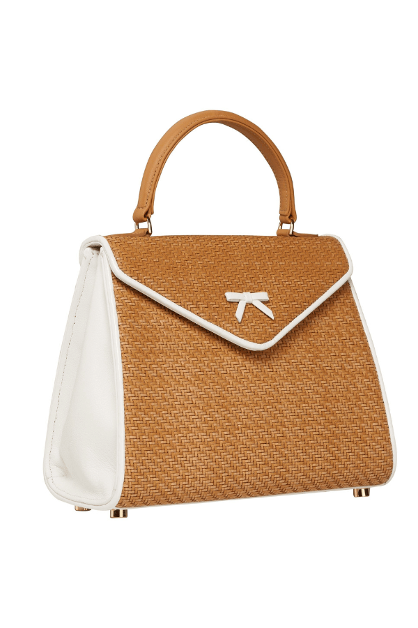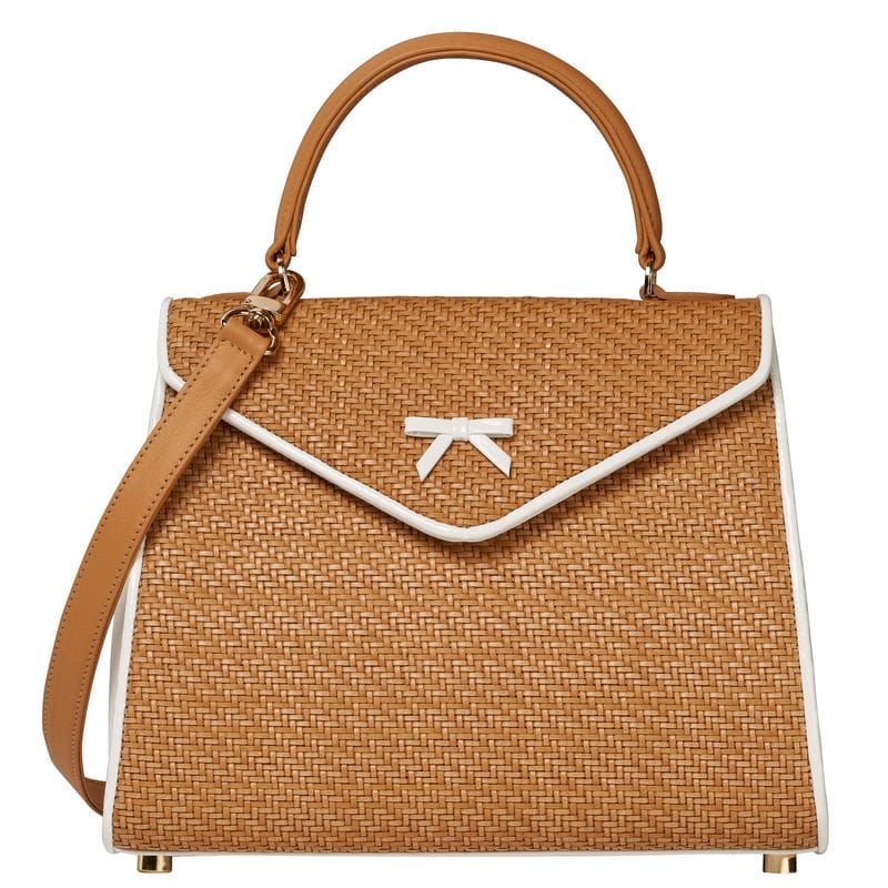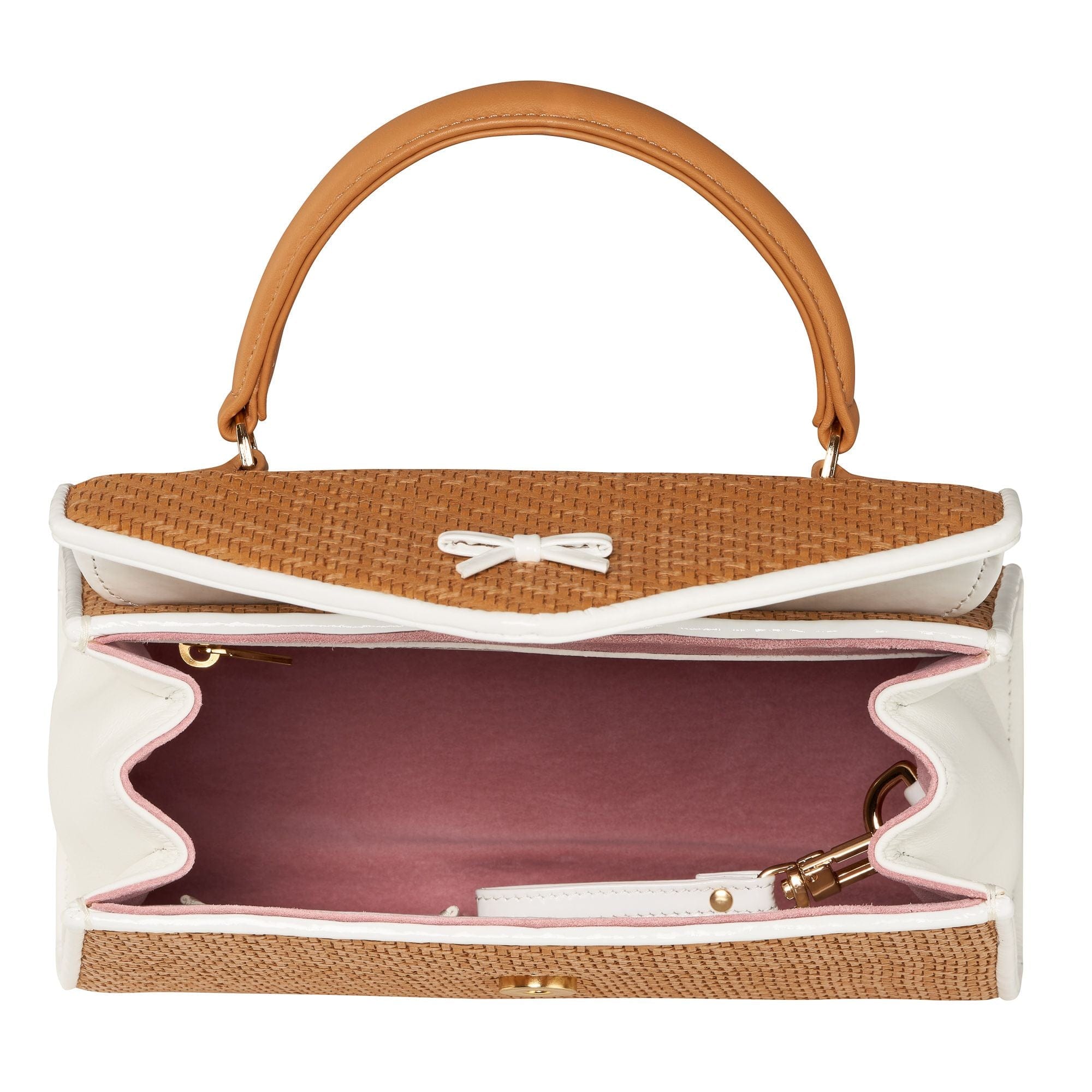 Handmade in New York, this Hayden Lasher Belgian Bag brings a fresh, summery feel with its natural woven herringbone design, accented by crisp white patent piping and the signature bow. White leather gussets and gold hardware elevate the look, while a magnetic snap reveals a powder-pink suede interior with a zipper pocket and gold key ring. Finished with a removable, adjustable shoulder strap for easy versatility.