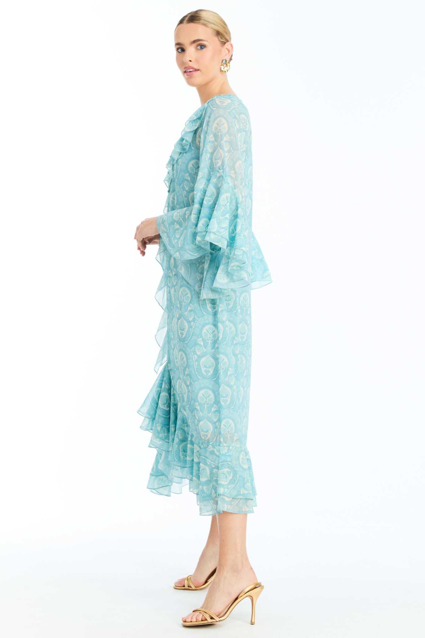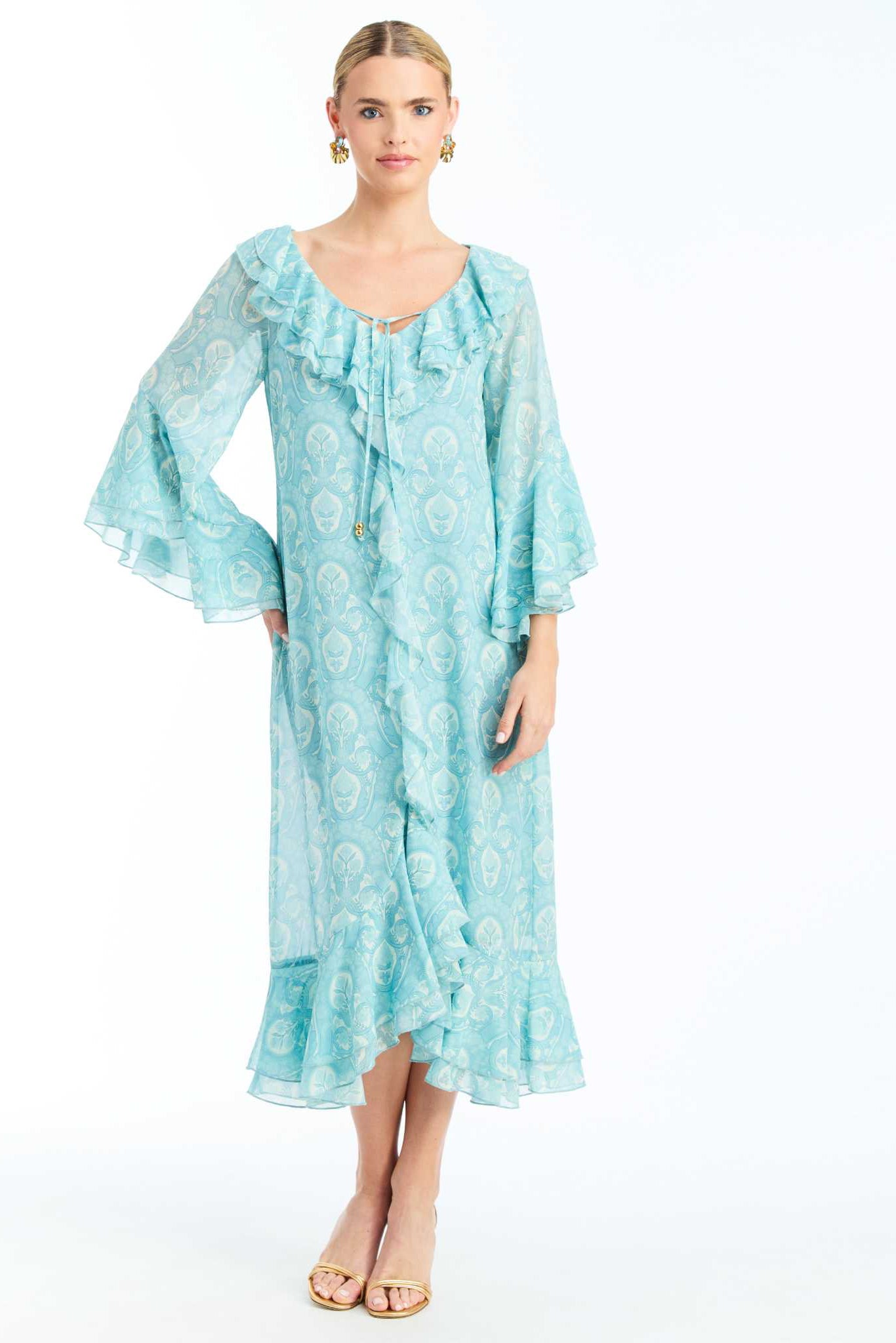 • Printed midi-length chiffon caftan with cascading ruffle detailing