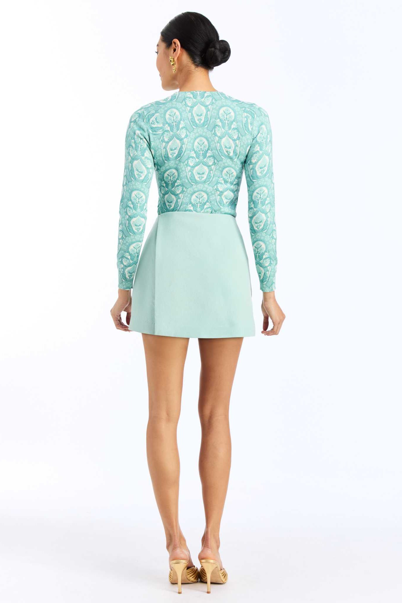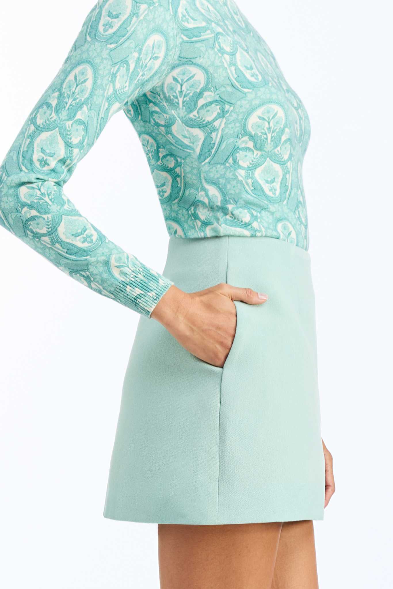 - A-line silhouette with overlapping front skirt panel and straight hem for a flattering, streamlined fit