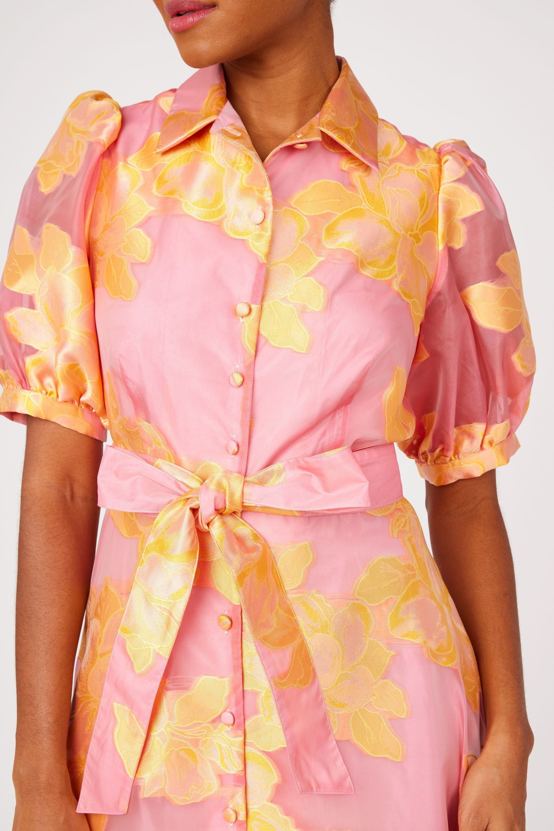 A beautiful choice for the Mother of the Bride. Crafted from airy organza, this full-length silhouette features a soft peony print in a fresh sorbet hue, offering a romantic yet sophisticated presence. The classic collared neckline, short sleeves, and button-front bodice provide polished coverage, while the fitted waist flows into a graceful skirt for elegant movement. Timeless and flattering, the Charlotte Gown is perfectly suited for spring and summer weddings and formal celebrations.