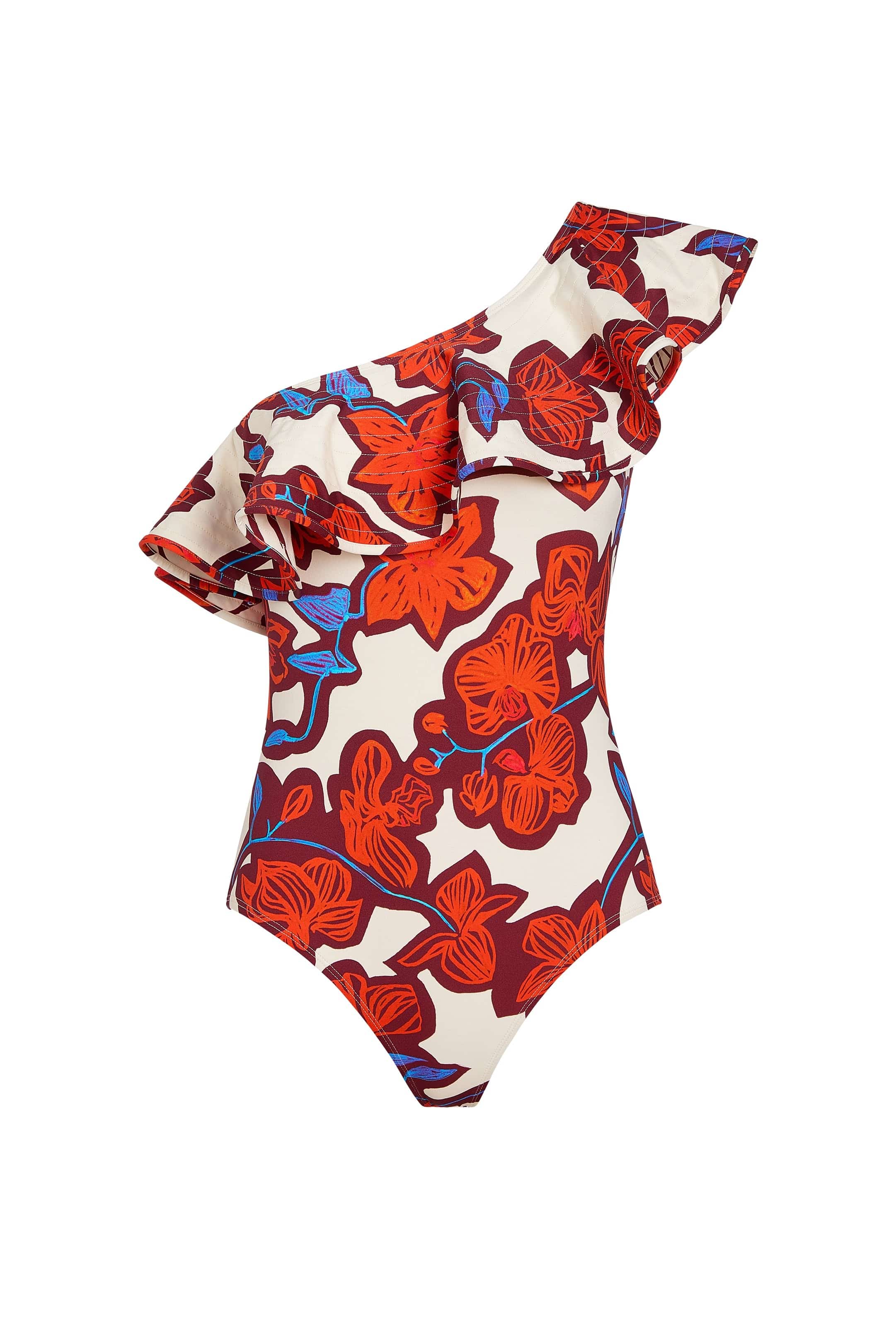 Arriving in a bold red-and-blue tropical Orchid floral, this Marissa debuts as the first printed iteration. Featuring a classic one-shoulder silhouette and a dramatic, trapunto-stitched structured ruffle, the design is finished with a Lionfish red-and-white zebra stripe backing—a detail that truly elevates. Universally flattering and effortlessly striking, this piece is ready for your next tropical escape.