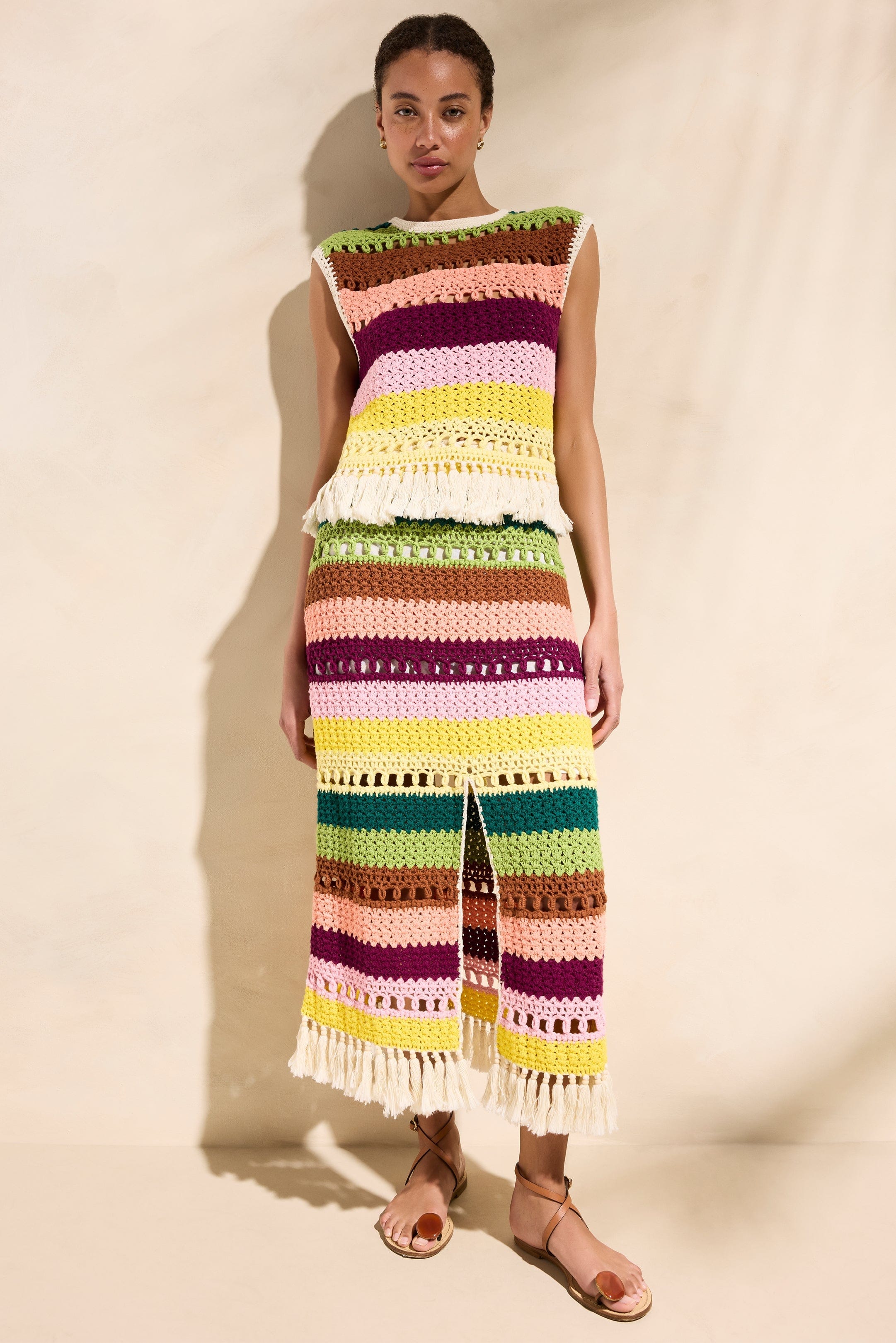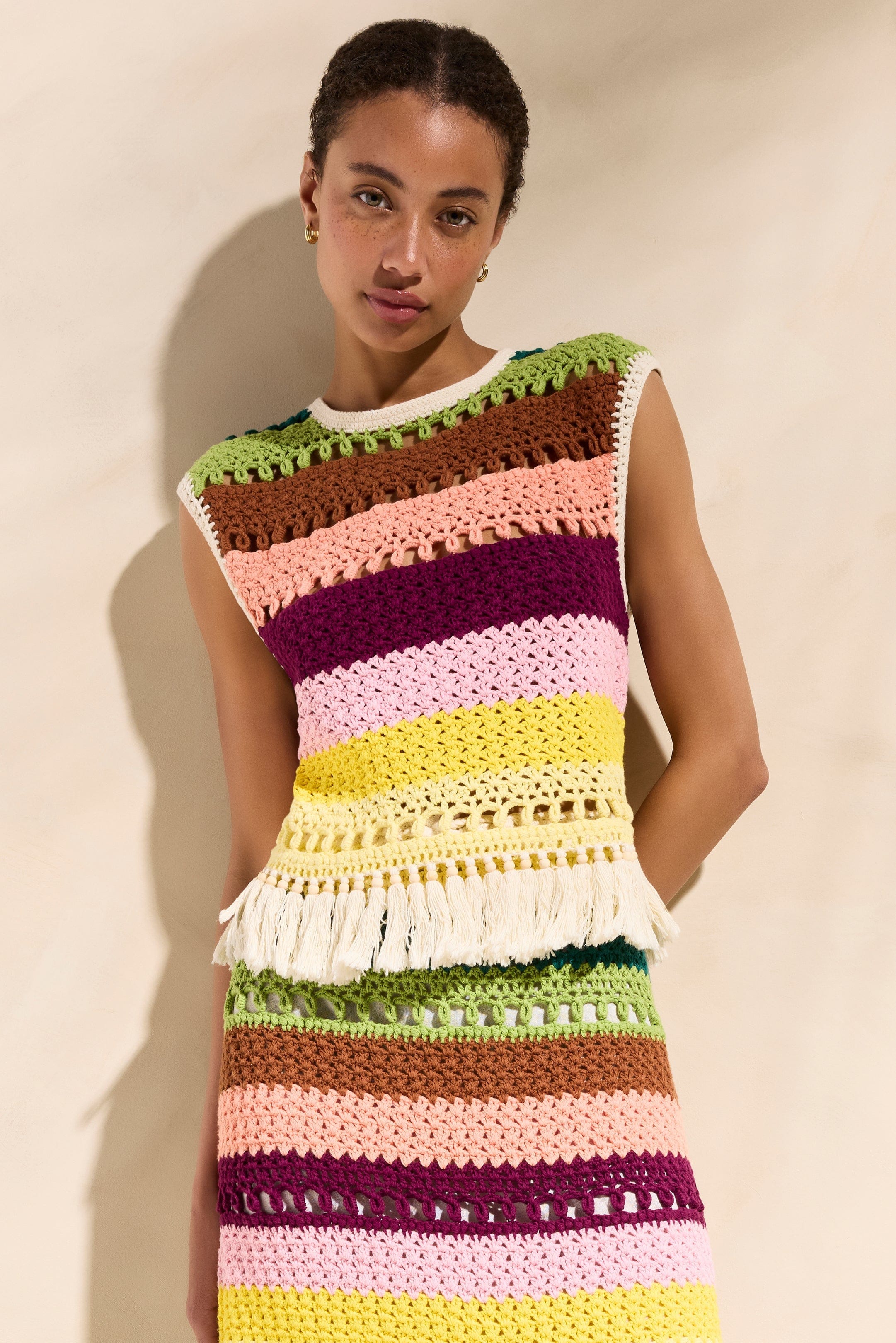 Picture yourself sipping spritzes on the Amalfi coast in this striped crochet shell, splashed in a sunny Mediterranean color palette. With subtle cap sleeves, a tassel hemline, and beaded accents, Lana makes for a chic resort-ready set when paired with the matching Mindy skirt.
