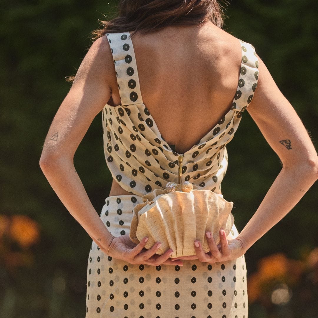 This hand folded shell purse is made using an origami technique to mimic a scallop shape. This semi abstract shell clutch is available in three neutral colorways to complement any warm weather outfit.