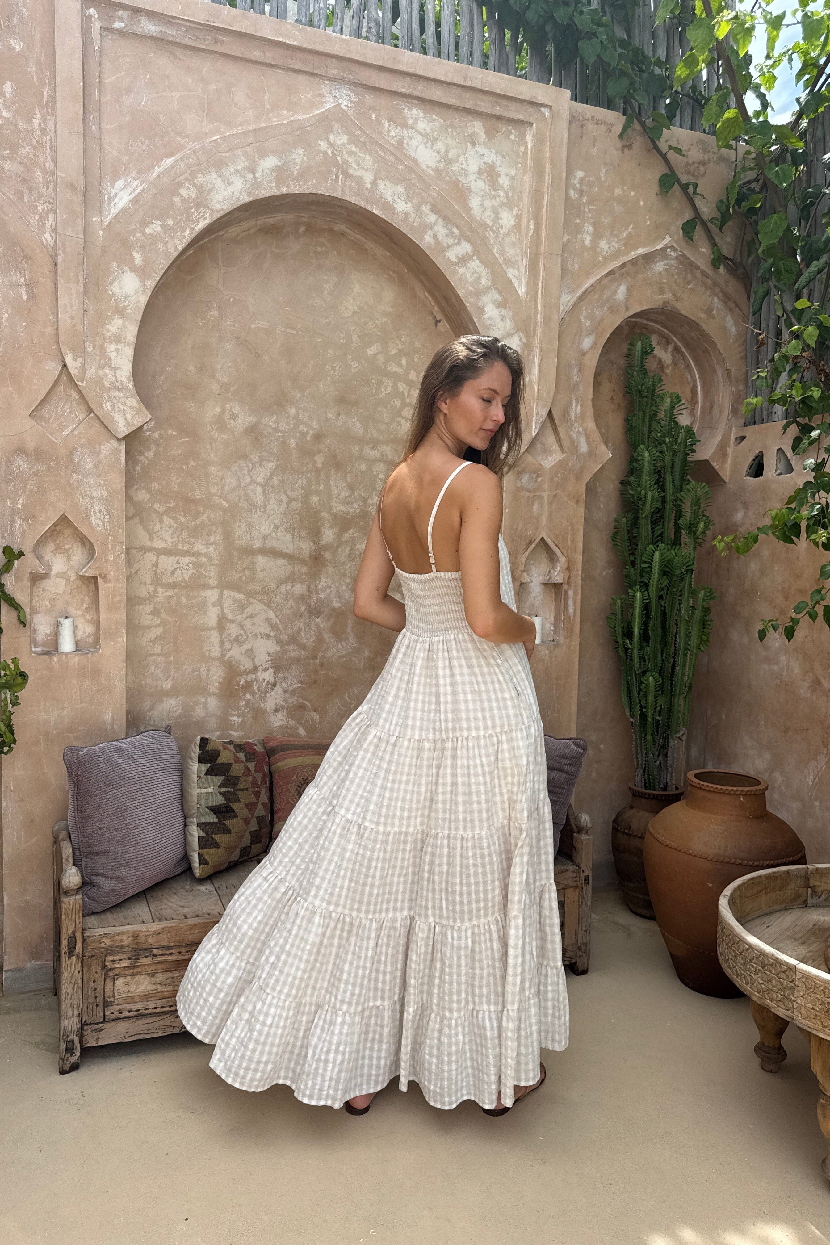 The "Waverly" in one of the best-selling beige check fabrics. Designed with tiered details and adjustable straps, it’s a versatile choice for warm days. Whether you’re enjoying a picnic or a day by the water, this flowy dress combines simplicity and style effortlessly.