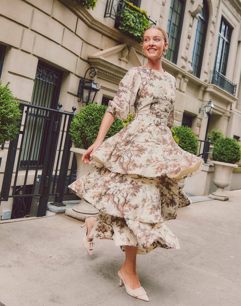 The Rhonda Convertible Midi Dress brings dynamic design and elevated charm to your wardrobe. Crafted in our signature Chestnut Brown Toile print, this versatile style seamlessly transforms from midi to mini with a hidden zipper in the skirt tiers, perfect for maximizing wear from daytime gatherings to evening celebrations. Feminine and functional, it features flattering princess seams, pockets, and a flared silhouette designed to move beautifully with you.