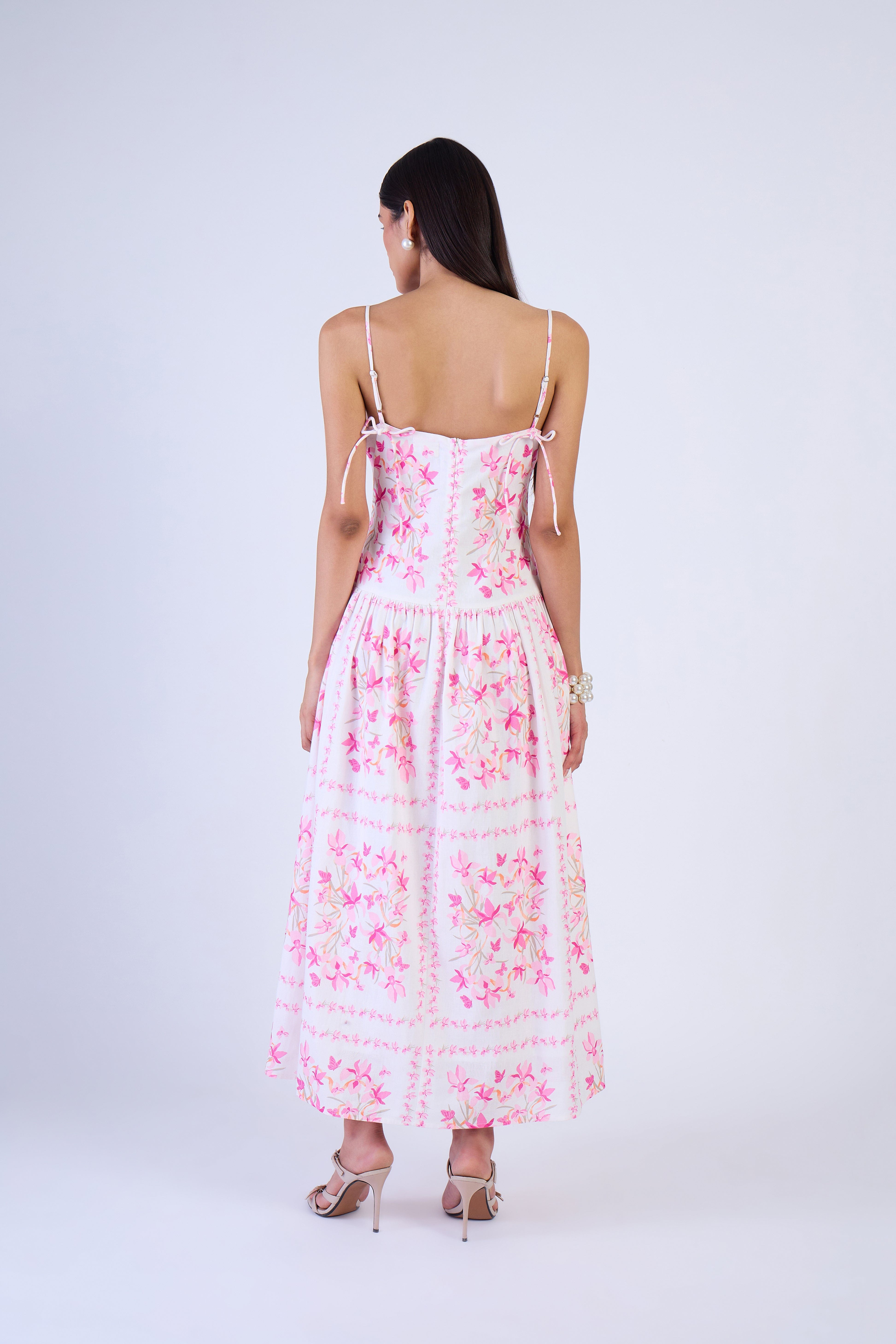 Be the best dressed guest in the head-turning Lucy dress. A flattering fitted bodice, drop waist, and adjustable straps meet charming bow details at the front and back. Finished with pockets and an elegant midi length. Lucy is crafted from a unique blend of cotton and linen, offering a soft, breathable feel and a beautifully textured finish. In this delicate artwork, butterflies and daffodils unfold in soft, tile-like symmetry. The design transports you to Vienna’s Imperial Butterfly House, where hundreds of free-flying butter- flies drift through a stunning Art Nouveau palm house.