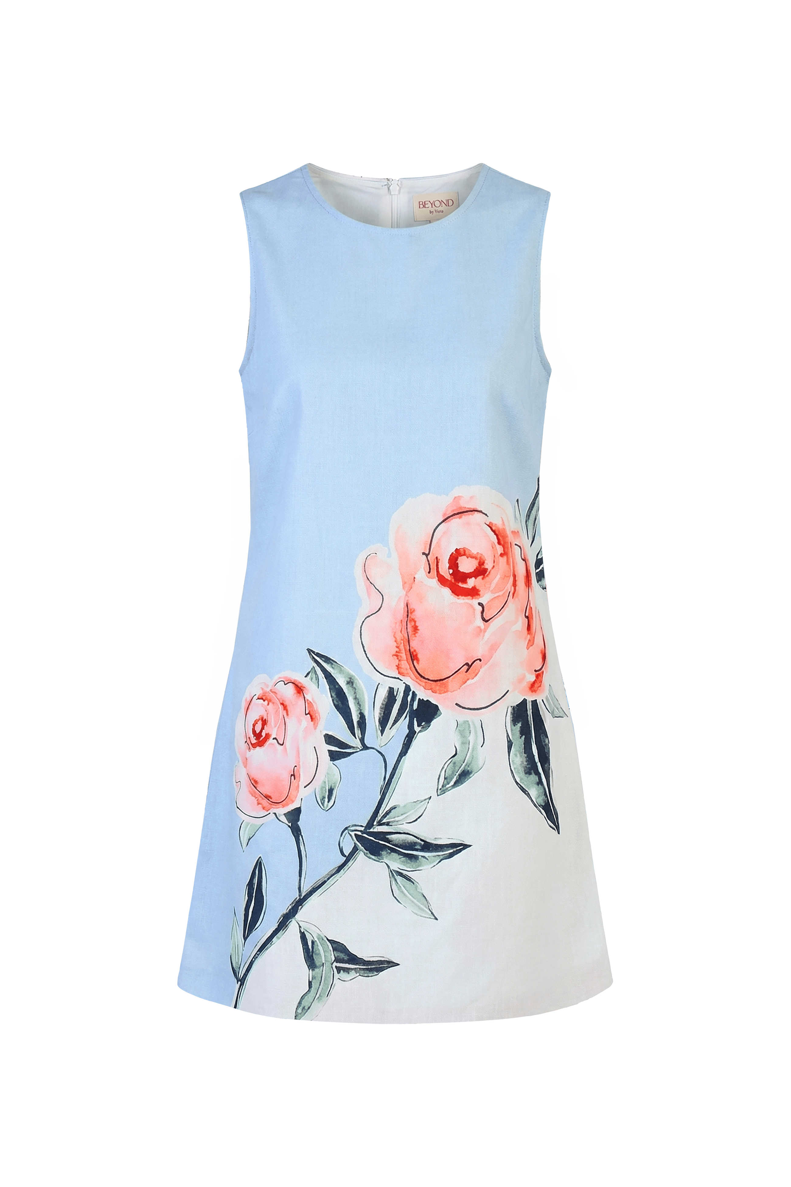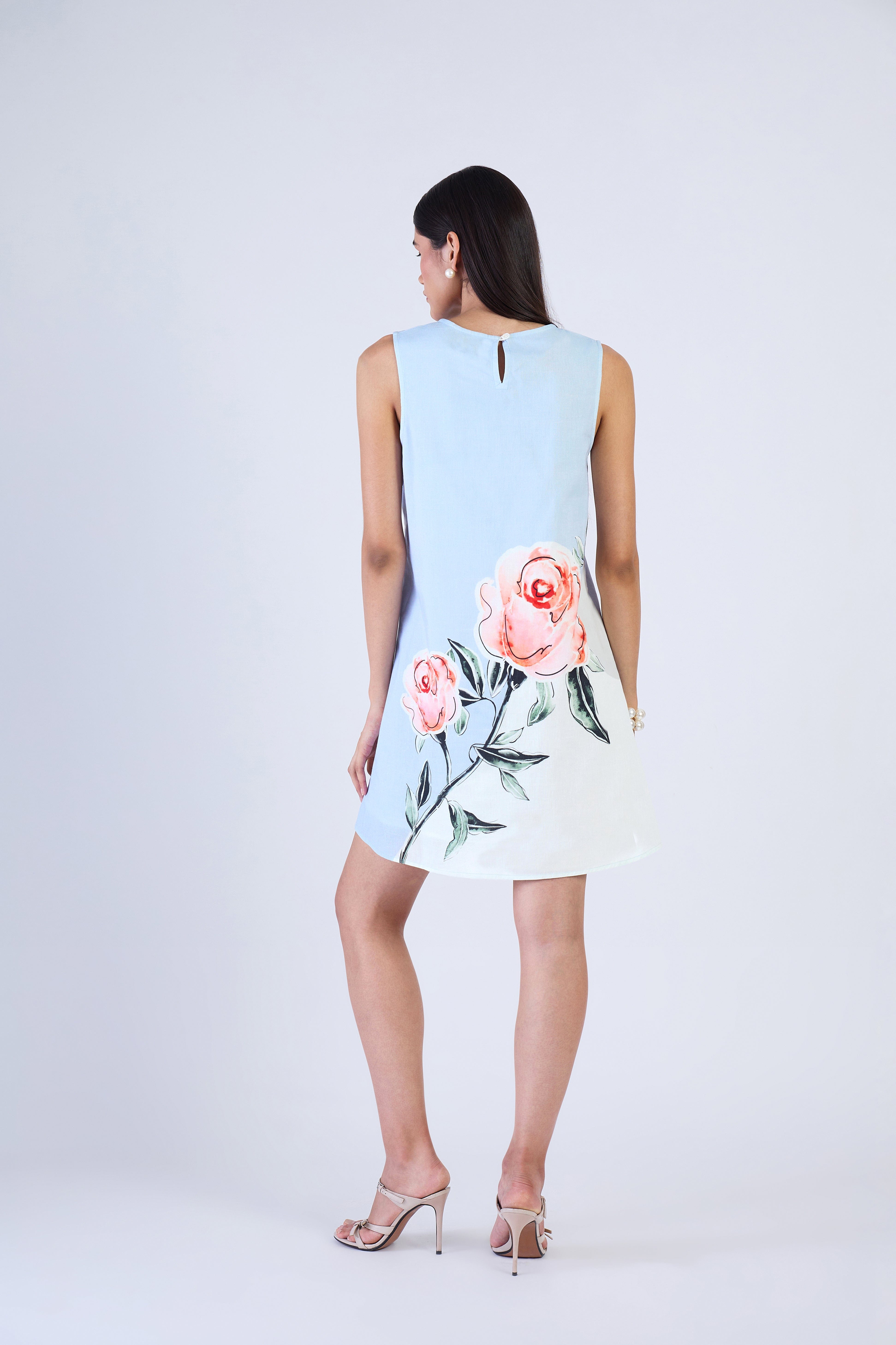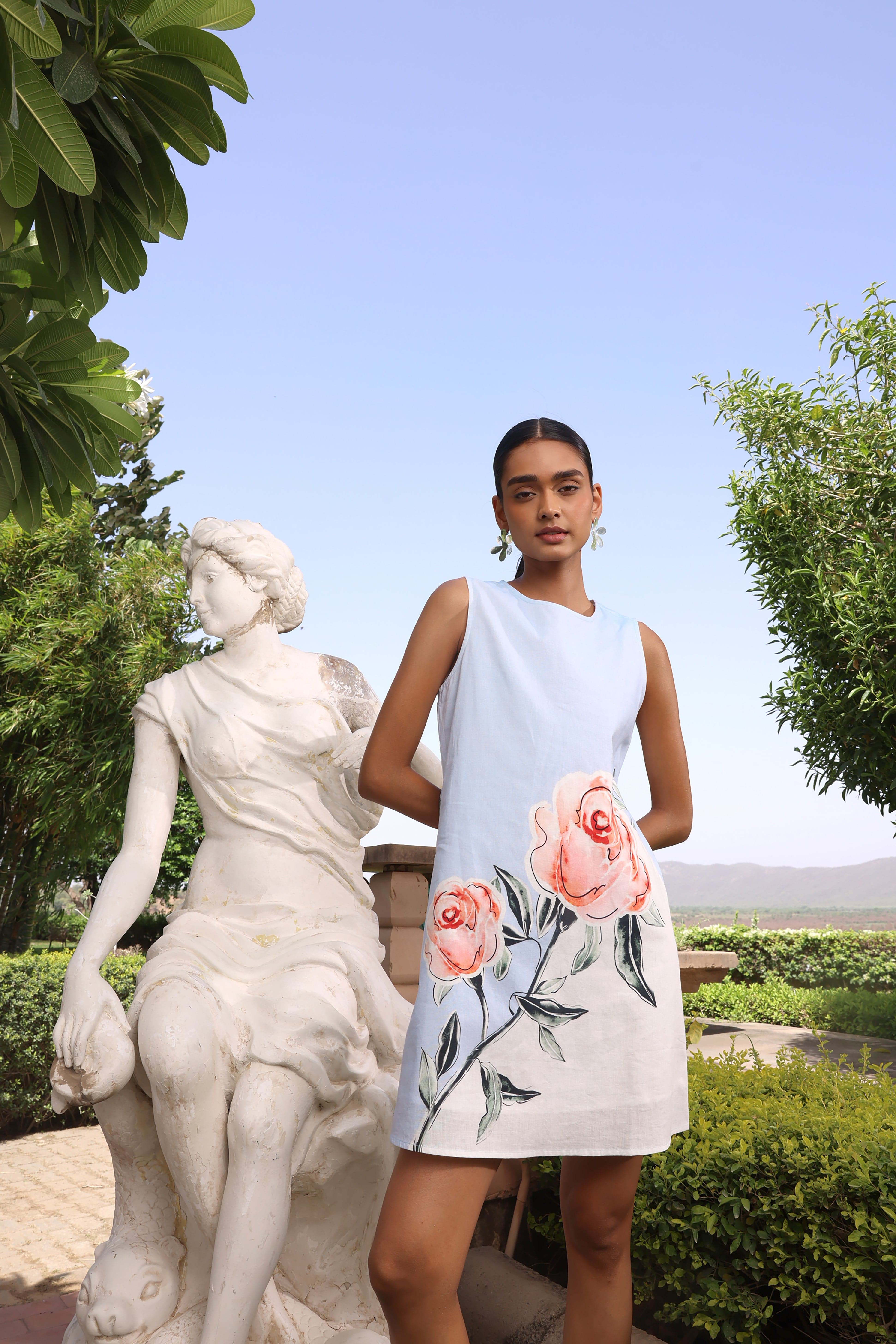 Effortlessly chic, the Frankie reimagines the classic 1960s mini with a modern twist. Its clean shift silhouette and subtle A-line shape flatter the form while keeping things easy and elegant. Frankie is crafted from a unique blend of cotton and linen, offering a soft, breathable feel and a beautifully textured finish. Named after Villa Céleste, a grand heritage home nestled along the cliffs of Cap Ferrat, this print draws from its sea-facing gardens and pale, weathered roses. Rendered in soft watercolors, the florals echo the quiet elegance of summers by the Mediterranean.