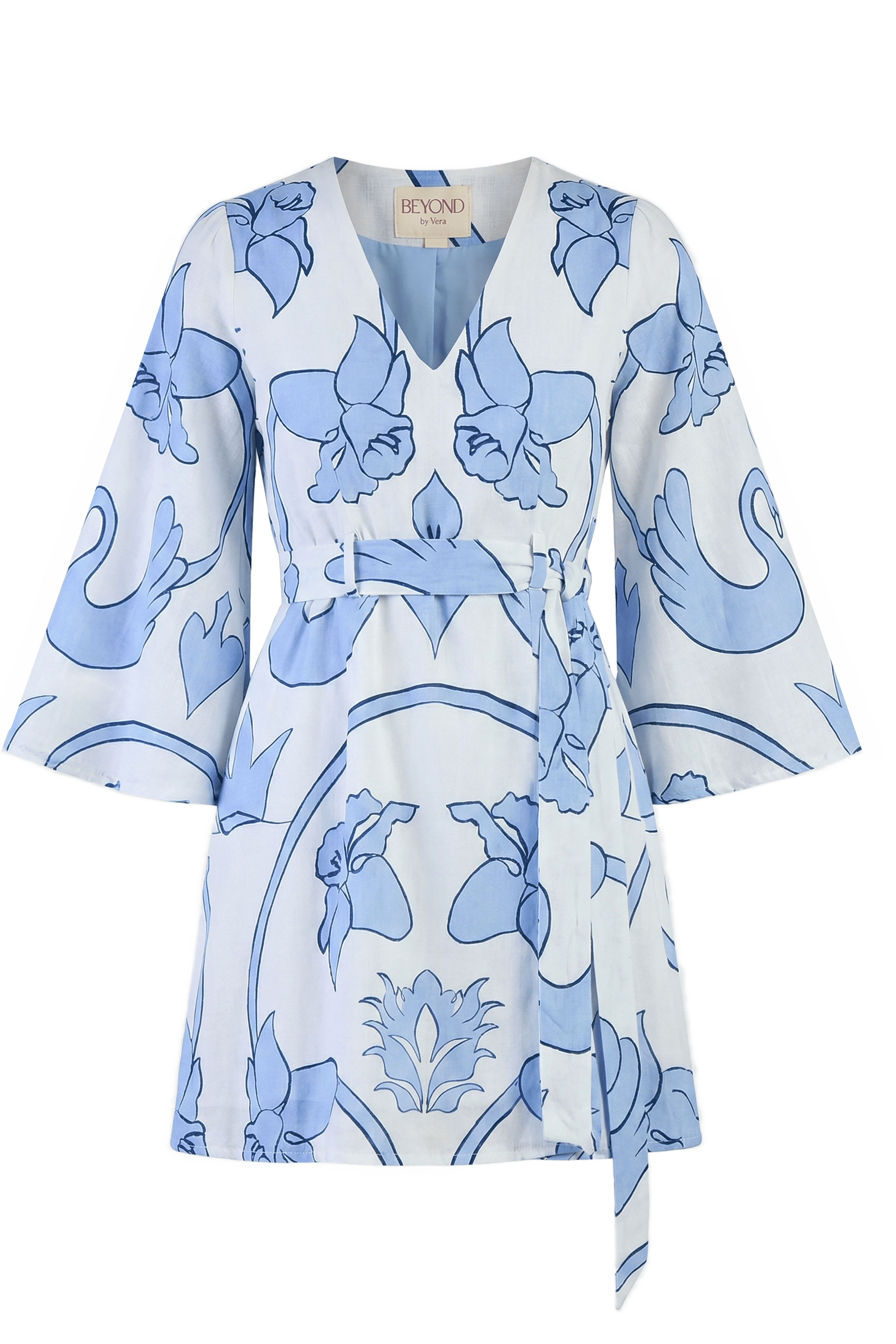 Say hello to Kennedy, a chic mini dress that strikes the perfect balance between structure and ease. Designed with a flattering V-neckline, it features a semi-fitted waist that can be cinched with the attached belt. The slight A-line skirt adds effortless movement, while cropped bell sleeves bring a touch of playful elegance. Kennedy is crafted from a unique blend of cotton and linen, offering a soft, breathable feel and a beautifully textured finish. Channeling the quiet glamour of Monaco’s golden era, this print is designed for a modern Grace Kelly. Bold motifs of swans, crowns, and daffodils reference royal heritage and refined glamour.