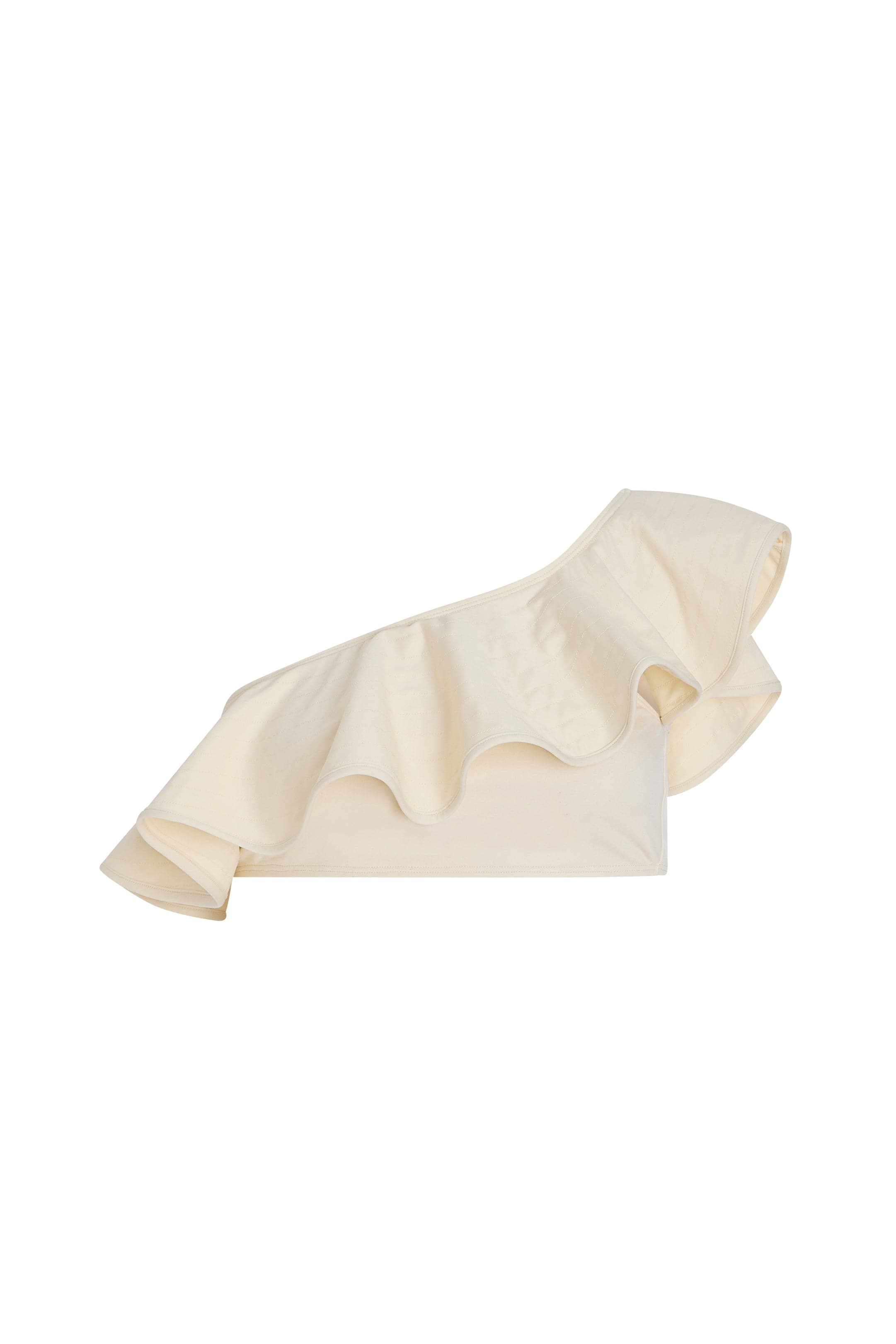 The bikini counterpart to the popular Marissa one piece, our new Doris top arrives in Turtledove with the same classic one-shoulder shape and dramatic trapunto stitched structured ruffle. Pair Doris back to the matching high-waisted Micha bottom to maximize the old-world glamour of the look.