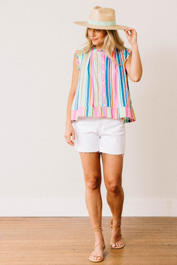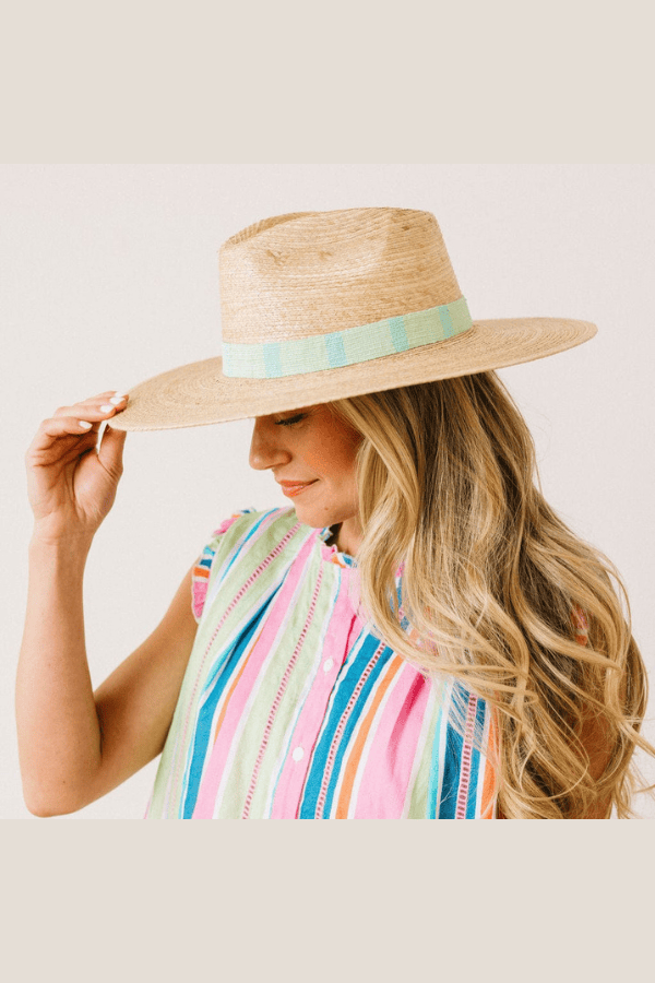 The Laguna Palm Hat features a seafoam cotton band with turquoise stripes and is a part of the sustainable, fair trade hat collection and graded at the highest UPF rating.