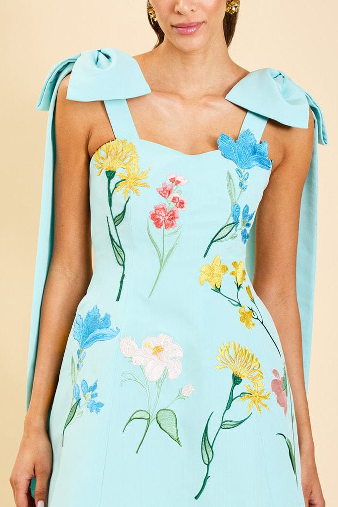 - Hand-sewn floral embroidered details at bodice and skirt